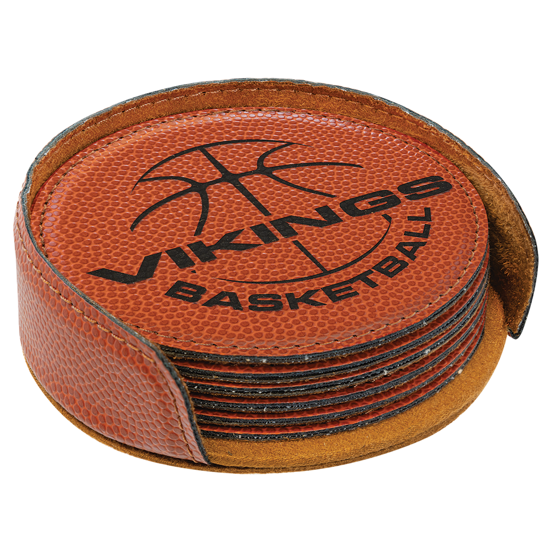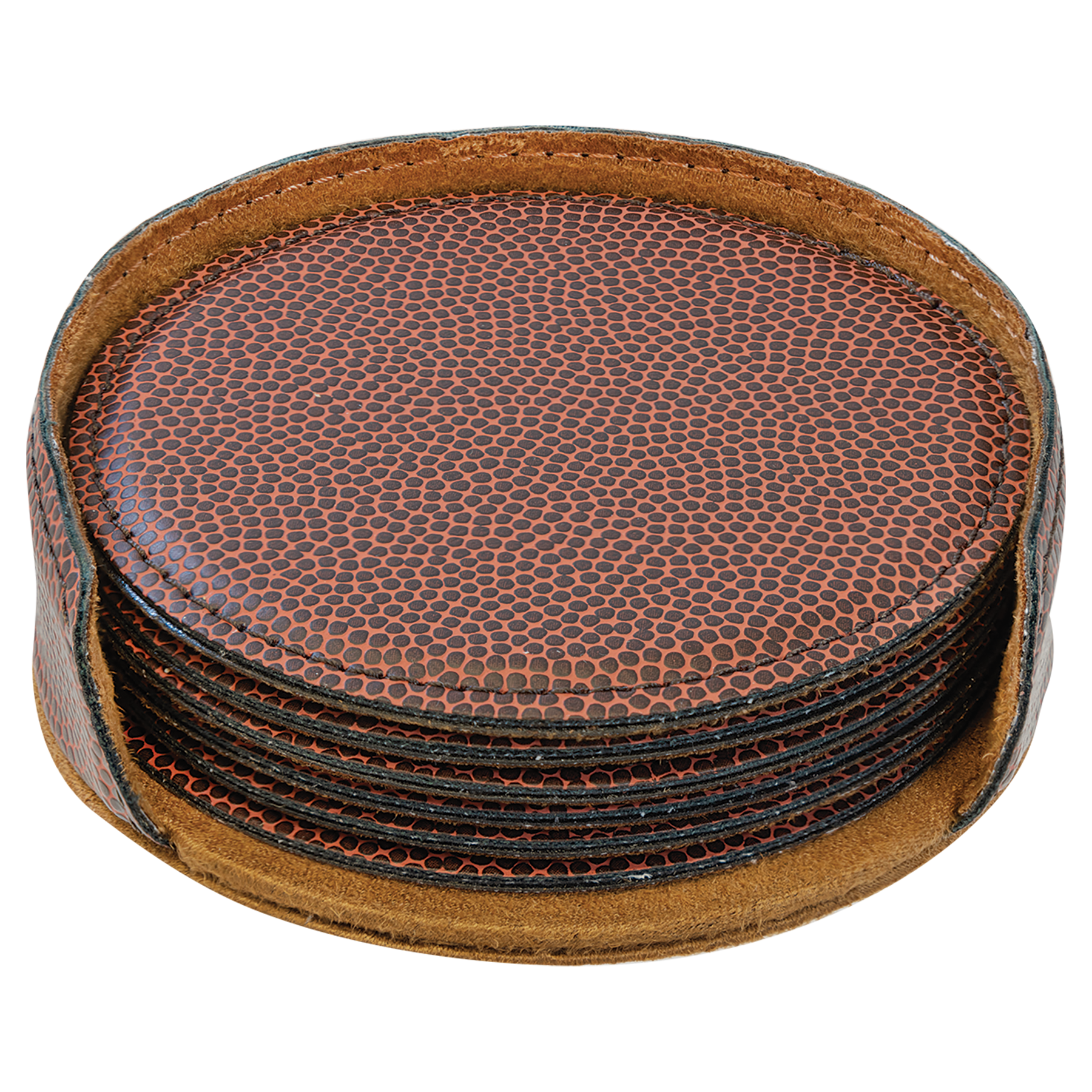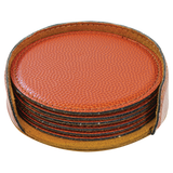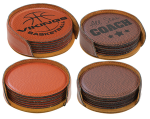 This set of 6 round coasters with a holder are made of leatherette, richly textured, and designed to replicate a regulation basketball or football. They are water resistant and durable enough to withstand the rigors of daily use.