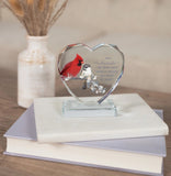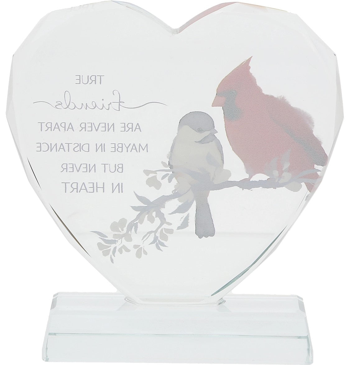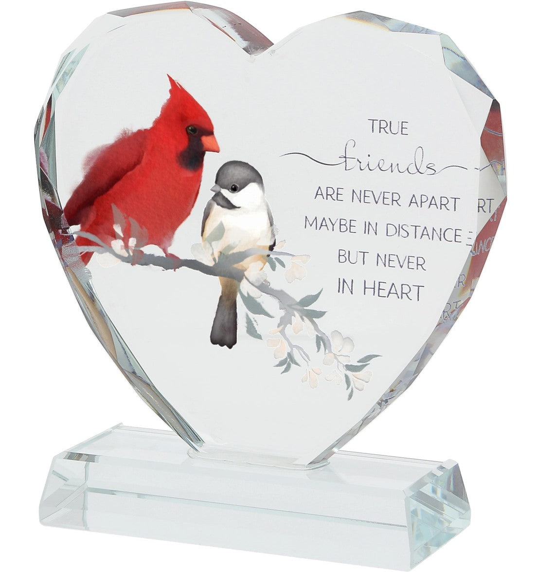 This striking 4" crystal heart plaque features the heartfelt sentiment, "True friends are never apart maybe in distance but never in heart," adorned with exquisite illustrations of a cardinal and chickadee. Crafted with durable high-quality crystal, its versatile design effortlessly enhances any home decor, while the radiant finish catches the light beautifully. Perfect for gifting, this plaque celebrates special friendships and serves as a daily reminder of cherished connections, making it an ideal accent for shelves, desks, or mantels in any living space.
