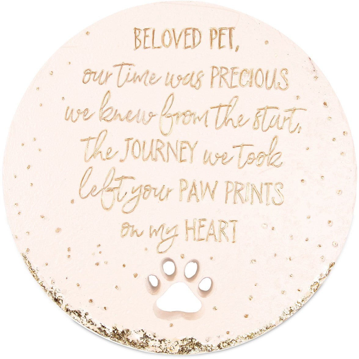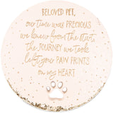 "Beloved Pet, Our Time Was Precious We Knew From The Start, The Journey We Took Left Your Paw Prints On My Heart" text and accompanying gold detailing are both debossed and painted onto the stone.