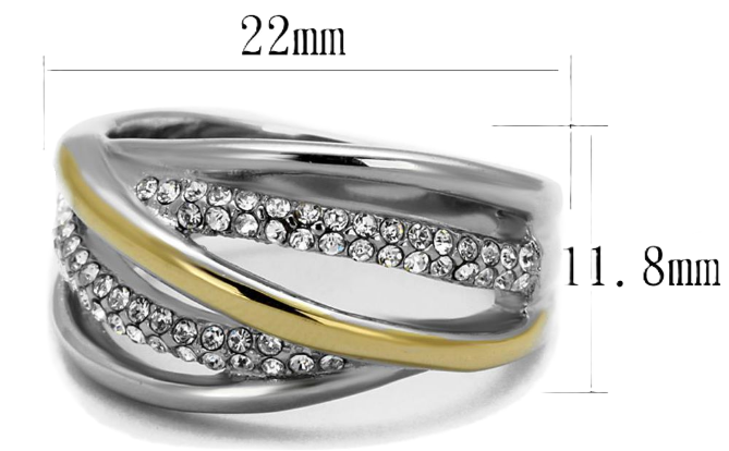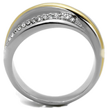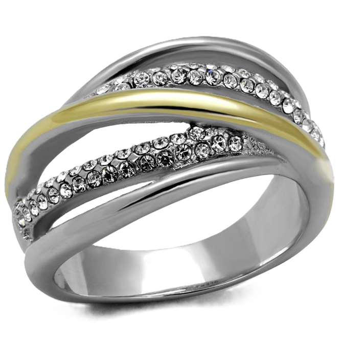 Two-tone gold plated stainless steel ring with top grade clear crystals.